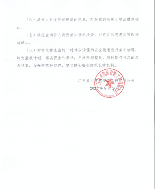 (二)、項(xiàng)目部對(duì)排查出重大安全隱患,應(yīng)及時(shí)向分公司和公司技術(shù)質(zhì)安部報(bào)告。重大安全隱患報(bào)告內(nèi)容應(yīng)當(dāng)包括:隱患的現(xiàn)狀及其產(chǎn)生的原因,隱患的危害程度和整改的難易程度分析, 隱患整改的治理方案。